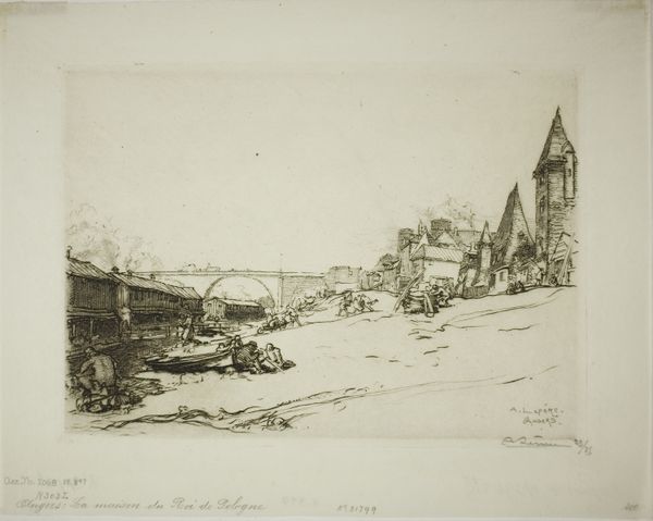 Editor: So, this is "View of the Church Amidst Low Houses in Scheveningen," a pen drawing by Dick Ket, dating between 1912 and 1940. I find the sketch almost dreamlike, the lines are so raw and expressive. What strikes you when you look at it? Curator: The church, of course, is central, visually and symbolically. Consider what a church represents: community, faith, permanence. But here, the lines are wavering, almost uncertain. Do you think this reflects a societal shift occurring between those dates? A questioning of tradition? Editor: That’s interesting! It’s like the church, even as the tallest structure, isn’t firmly planted. And I notice the houses clustered around it, almost clinging to the church. Curator: Exactly! They huddle close, visually supported by it. Consider Scheveningen as a fishing village. The church also functioned as a maritime landmark. So, this isn’t just a religious symbol; it’s integral to their livelihoods, their sense of place. Notice the contrast in textures, the way the landscape flows versus the more deliberate strokes describing the man-made structures. What does that evoke for you? Editor: A vulnerability, maybe? Like humanity staking its claim on an uncertain environment. Also, is it me, or are the rooftop lines wobbly? As if seen through heat or water. Curator: Excellent observation! That visual instability reflects, perhaps, a psychological unrest. It prompts the viewer to wonder about their own foundations – both literal and metaphorical. Editor: I never would have considered all those layers just from a simple sketch! Thanks, this helped me look way beyond what's simply on the surface. Curator: My pleasure. Sometimes the most profound statements are whispered, not shouted, wouldn’t you agree? The intimacy of a sketch holds power precisely because of its quiet vulnerability.