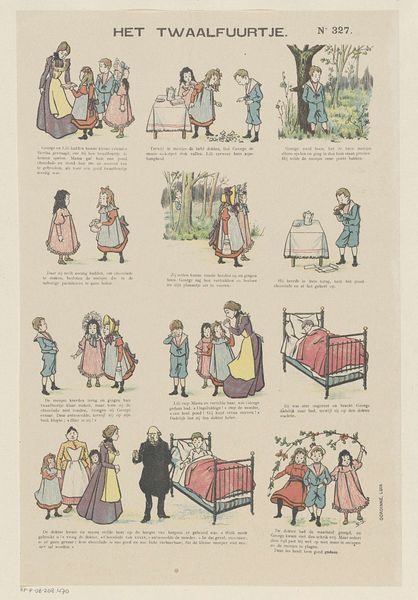 Editor: So, this print, called "Witje" by Monogrammist G.J., dates between 1894 and 1959 and it's made using ink on paper. It reminds me of an old comic strip, all these little vignettes following the lives of these kids and their dog. What stands out to you when you look at this piece? Curator: I'm drawn to how "Witje" captures a certain idyllic vision of childhood. The scenes, depicting children at play and their relationship with the dog, construct a very specific narrative. Let’s think about the historical context. In what ways does this ideal childhood maybe uphold certain societal structures of the time? Consider class and gender dynamics within the images themselves, and the larger culture. Editor: That's interesting. I guess I hadn't thought about how curated these "everyday" scenes might be. I suppose the clothing, the well-kept landscapes—it speaks to a certain privilege. Curator: Exactly. And think about the potential power structures at play, maybe between the children, the dog, and even the adults subtly present. What assumptions are being made about the dog’s role? This could tell us a lot about historical attitudes towards animals. Editor: I see what you mean. It’s not just a cute comic. It reflects social norms of the era, and, perhaps even some less savory realities that may have been deemed perfectly acceptable back then. Curator: Precisely. By considering its historical moment and what is absent in the representation we can critically assess what societal narratives the work perpetuated, even unintentionally. This helps us draw a link between art history and today. Editor: That's given me a whole new way of seeing the print, now and its significance in its own time. Thanks! Curator: My pleasure! Critically engaging with art empowers us to examine ourselves and our history.