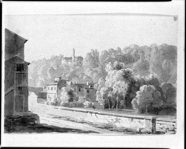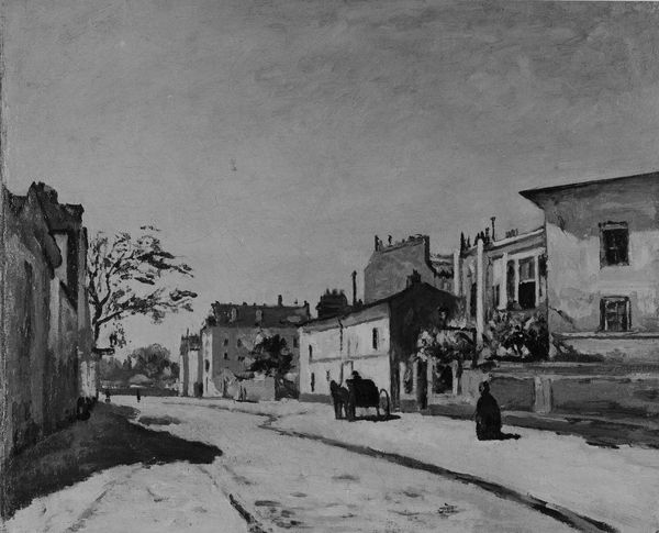 Curator: "Entrance to the Park at Saint-Cloud" painted around 1802 by Jean-Victor Bertin, what strikes you about this piece? Editor: It's quite architectural, almost severe in its geometry. It seems meticulously planned. I’m curious, what do you see in this seemingly simple scene? Curator: Look closely at the muted palette. Bertin meticulously layered oil paint, a costly commodity back then. The park, accessible only to the wealthy, underscores how materials reflected and reinforced class structures. It speaks volumes about who controlled resources and defined aesthetic values. What implications do you see in his choice of oil paint, the pigment, and canvas supports? Editor: The oil paint provides that smooth, almost porcelain-like surface, very different from say, rougher fresco. So, it’s not just depicting the park, but the smooth surface embodies the polish of the elite who access it? Curator: Precisely. The almost invisible brushwork, the smooth gradation of tones... all that suggests a highly controlled artistic process, reflective of the rigid social hierarchies of the time. And consider the labor involved - from grinding pigments to preparing the canvas. Whose hands actually made this painting? Editor: So the means of production - the paint itself and who produced it, the act of creating and whose money enabled its creation - becomes inseparable from what’s depicted? Curator: Exactly! By deconstructing the material reality behind its creation, we get insight into how art-making intersects with larger networks of power, labor, and economic exchange in early 19th century France. Now, doesn't that perspective change your view? Editor: It really does! I hadn’t considered the socio-economic context inherent in the materials. It shows how everything is so much more interwoven than I initially thought.