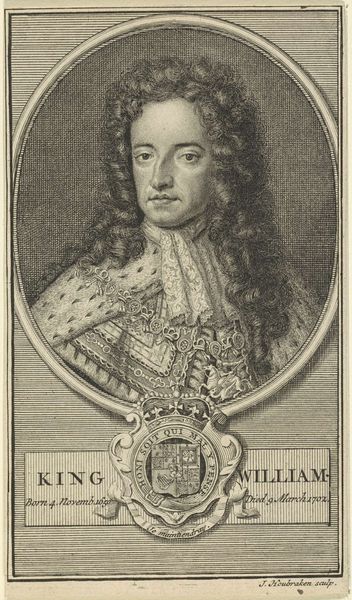 Jan Caspar Philips created this portrait of Willem III, Prince of Orange, using etching techniques. The image is rich with symbols of power and authority, notice the ermine robes and armour, emblems of royalty and military strength. Below Willem, observe the detailed naval scene, a nod to his maritime power. This echoes a long history of rulers associating themselves with naval dominance, as far back as ancient Roman imagery, where emperors were depicted with Neptune, god of the sea. The oval frame is a form used to indicate importance, reminiscent of ancient cameos of emperors, but has become commonplace, almost kitsch. The gesture of framing, encasing the sovereign, speaks to our collective need to contain and control powerful figures. These symbols are not static; they evolve and resurface, charged with new meanings by each generation. It's a cyclical progression, reflecting our continuous negotiation with power and authority across time.