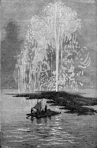 Curator: Oh, this drawing by Édouard Riou, titled "Journey to the Center of the Earth," created in 1864 using ink, engraving and printmaking techniques, presents an intriguing visual narrative. It’s such a dramatic scene. Editor: It's so stark! All that monochrome really amplifies the dramatic quality of it. It’s unsettling in a Romantic kind of way, like Caspar David Friedrich but, dare I say, more claustrophobic. Curator: Claustrophobic, yes, but perhaps appropriately so! Remember, the narrative focuses on descending into the unknown interior of the earth. That towering, broken structure in the foreground; its columns look as though they lead directly into a submerged world, guarded by that craggy peak in the distance. Riou captures this idea of literal and symbolic descent so vividly. Editor: Absolutely! The dark structures contrasted against the light from the moon... and what about the use of birds in this image? Are they trying to show scale and perspective, or is Riou maybe trying to imply themes of freedom against an inescapable background? Curator: I like the way you connect the image with that reading. The birds, yes, their presence enhances the sense of scale, of monumental vastness, but also underscores the feeling of vulnerability. Note that these creatures appear small in relation to the water crashing over the columns in this subterranean realm. There is also something so ominous with that singular light that shines down to them, almost like it will envelop all life if it gets too close. It’s foreboding. Editor: I suppose, stepping back, this piece says much about the nineteenth century's fascination with scientific exploration, and humanity's desire to map the unseen. It certainly makes one question how we project our societal anxieties onto new frontiers. Is exploration a triumph, or an opening of Pandora’s Box? Curator: Indeed! And by using imagery resonant with classical ruins and sublime natural vistas, Riou invites viewers to consider the cultural weight we assign to progress. "Journey to the Center of the Earth" it is not just a thrilling adventure story, but an interrogation of the human spirit facing the awesome unknown. Editor: Looking at it again, I realize that in that period it was still the Romantic era, when emotions began to supersede traditional ways of thinking. Curator: Well said. Thank you for those interesting observations.