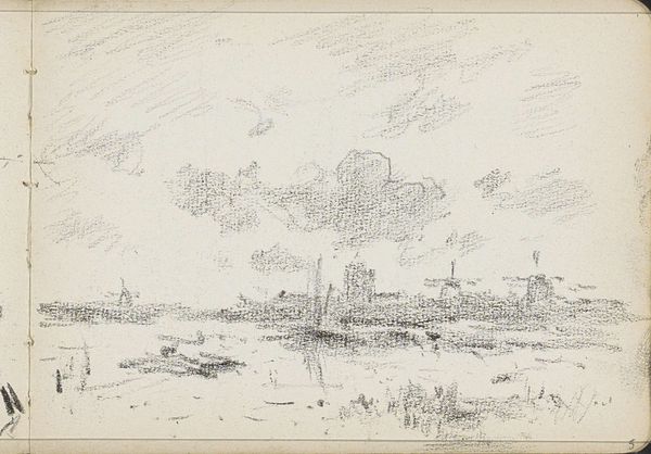 Curator: We are looking at “Stadsgezicht, mogelijk Kampen,” or "Cityscape, possibly Kampen," a pencil drawing on paper, made by Adrianus Eversen sometime between 1828 and 1897. Editor: It feels preliminary, almost dreamlike. There's a haziness to the whole composition that softens the industrial elements I'm seeing—particularly that smokestack in the distance. Curator: Yes, notice how Eversen manipulates line weight. The delicate hatching builds volume and defines the structures, from the windmill dominating the horizon line to the more roughly hewn sheds in the foreground. Semiotically, this speaks to a nuanced approach in representing spatial relationships. Editor: The roughness in those foreground structures catches my eye too. You can almost feel the texture of the weathered wood. I'm also intrigued by the marks along the water's edge; are they anchoring points? And who were the laborers constructing and maintaining these essential infrastructures of a 19th-century Dutch town? Curator: That question transcends pure formalism, venturing into the artwork’s possible context, but it’s true we could examine the implications of this focus. See how the artist plays with horizontality and verticality? The city unfolds linearly, grounded by the towering vertical accents of the windmill and that chimney. It's a carefully balanced composition. Editor: Absolutely. That interplay feels… intentional. What sort of paper do you suppose Eversen would’ve chosen? The smooth surface is paramount to translating such details, as it must faithfully pick up graphite subtleties under shifting pressure to conjure convincing material illusion and atmospheric depth. Curator: Fascinating to consider the selection in that regard. The image leaves us contemplating both its intrinsic visual elements and also that element of implied historical framework. Editor: Indeed, an insightful look into artistic production practices—from material procurement to labor economics.