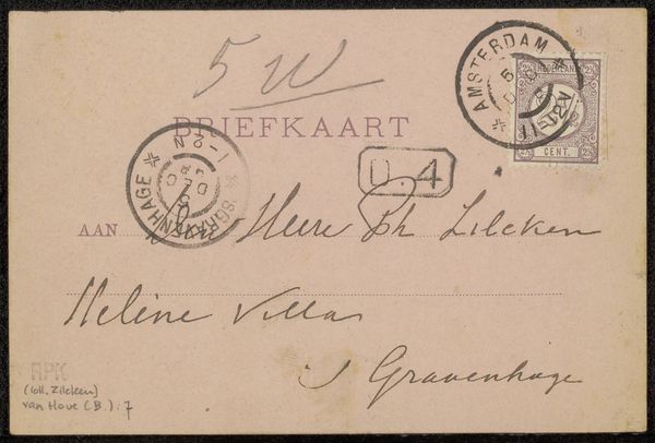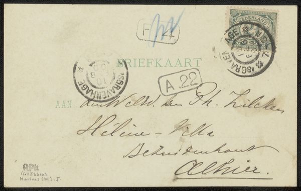 This briefkaart, or postcard, sent to Philip Zilcken, carries more than just a message; it bears the weight of symbols marking time and place. See the postal stamps. Each acts as a cartouche, an emblem sealing a moment in history. Consider how such seals, throughout antiquity and even now, serve as both a practical tool and a marker of authority, imbuing the mundane with significance. The circular stamp mirrors the ancient oculus, a symbolic eye through which light—and in this case, correspondence—passes. The gesture of sending a postcard itself is a ritual, a secular echo of votive offerings. These small acts of communication create a cultural memory, not unlike the way Renaissance artists revived classical motifs, repurposing them for new emotional expression. This card, seemingly simple, is embedded with layers of meaning, each mark a trace of human intention and historical resonance.