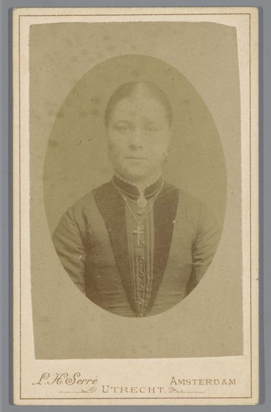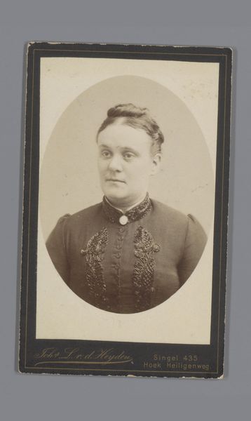 Editor: Here we have Pieter Siewers' "Portret van een vrouw," made sometime between 1857 and 1898 using the albumen print method of photography. I am struck by her steady gaze and how posed she seems, which gives the photo a sense of dignity. How do you interpret this portrait? Curator: That’s a keen observation. Given the historical context, it is hard not to think about the social constraints placed on women during the Victorian era. Her dignified pose could be a way to project respectability and control in a patriarchal society where a woman’s worth was often tied to her reputation and appearance. What do you think the setting and clothing suggest about her class? Editor: I would guess that she is from a middle-class family, as the decorations on her clothing and hairstyle appear carefully crafted. But how can you really tell for sure from a photo? Curator: You're right, appearances can be deceiving, and it’s vital to contextualize these images with social histories of the time. Photography was also becoming more accessible, broadening its use across different classes, though formal portraits might still signal a degree of affluence or social aspiration. In what ways might she be pushing the boundaries of expected gender norms? Editor: I never really thought about photography as something political. It makes me see her as more than just someone in an old photograph. It's a window into a whole era of gender roles. Curator: Exactly. By looking at the nuances in this woman’s representation, we start to challenge conventional historical narratives and amplify the voices of those who were often marginalized or misrepresented. What do you make of the portrait's realism in that context? Editor: I’m realizing the 'real' is itself constructed and shaped by so many social forces. Thanks for this conversation!