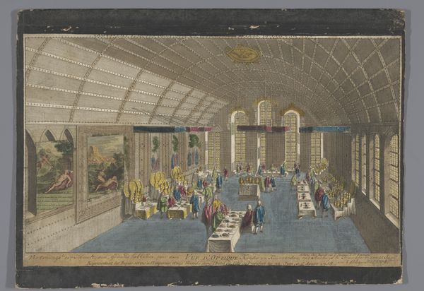 Curator: Looking at this image, I am immediately struck by a sense of theatrical grandeur. It's as if the church is a stage, with those elegantly dressed figures as the actors. Editor: Indeed. What we're seeing is "View of the Interior of Saint Martin-in-the-Fields, London" by Jean-Francois Daumont. This work, created sometime between 1745 and 1775, uses pen, colored pencil, watercolor and water colors to depict a scene that speaks volumes about the period’s aesthetic sensibilities and the place of the church within London’s social fabric. Curator: The Rococo style is so prominent here. That airy color palette, the focus on decorative elements, but even more interesting for me is thinking about how buildings shape behaviors, even dictate it! And this is no common gathering: bodies parade and interact within these boundaries that are physical as much as moral. Editor: Right. Daumont’s rendering gives us access to how the Enlightenment sought to shape not only sacred spaces but also civic life through architecture and its public role. This was a period of tremendous church-building in London; Saint Martin-in-the-Fields itself was quite new when this drawing was made, having been completed just a few decades prior. Curator: And by capturing this interior scene, Daumont’s piece documents social performativity inside the church; a perspective that helps understand better the way space and design can play a significant role in the making and display of social identity and political meanings. Editor: I would suggest that by showing these figures occupying and animating this new church, Daumont highlights not only the architectural marvel but the Church's ambitions, power, and function within a rapidly changing city. How spaces of worship also represent and actively reinforce power structures. Curator: It's like he's inviting us to contemplate how these places were constructed – both literally and figuratively – to shape public behavior and moral values, where social hierarchies come together under the auspices of the divine. Thank you! It gave me much to think about. Editor: Likewise! The intersection of art and socio-political history always reveals complex narratives.