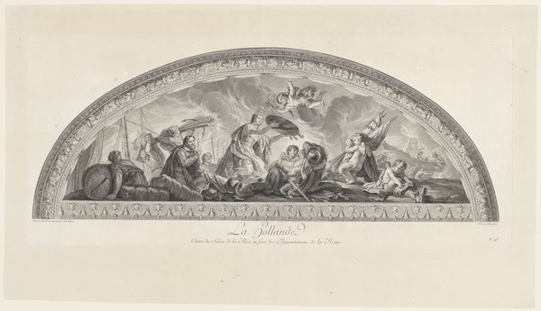 Editor: So, this engraving, “Triomf van Amphitrite” by Pierre Etienne Moitte, likely created between 1751 and 1780, presents the goddess Amphitrite in what looks like a celebratory procession on the sea. There's a real sense of dynamism, what with the waves and the mythical creatures pulling her chariot. How do you interpret this work? Curator: It's crucial to consider the Baroque style in vogue then, and the work as an allegory, deeply ingrained with the political power structures of the time. "Triumph" wasn't just artistic license. The subject's presentation reinforces an established hierarchy, doesn't it? The goddess stands above, supported by various figures in the sea. In Baroque art, these grand mythological scenes are rarely just for aesthetic pleasure. Think of it in relation to class and power: who benefits from this idealized portrayal of order and control over nature? What do you make of the use of nudity, a very persistent artistic choice? Editor: Well, the nudity, to me, reinforces the idealized image of the female form and...perhaps, power in vulnerability? Curator: Exactly! The classical and religious narratives were tools, reinforcing power through beauty. It asks: whose bodies were deemed worthy of representation and idealization, and what did that say about their position in society? Even the history painting aspects come into play – not just as storytelling, but legitimizing authority through a grand historical narrative. How do you think that affects the contemporary reception of this type of art? Editor: It’s certainly made me more aware of the social context. Seeing art this way offers a much deeper understanding. Curator: Agreed, placing art within social discourse allows us to critique power structures, unveil hidden narratives, and foster an informed approach to art history and contemporary creativity.