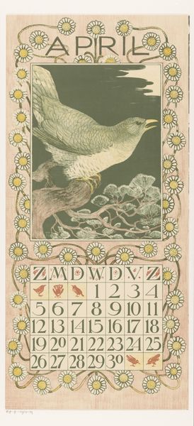 Curator: Here we have Theo van Hoytema's "Kalenderblad april met een hagedis," or "April Calendar Page with a Lizard," dating back to 1901. The medium is a color linocut, and the result is striking. Editor: It does feel immediately striking. The palette is very subtle but the design overall has quite a monumental feel. I see lizards, graphic design elements, what seems to be flowering plant life... it creates a sense of immersion in the spring. Curator: Note how Hoytema marries function with form; this isn't just a calendar, it's a carefully constructed composition. The placement of "April" at the top, the framing vines, even the reptilian motifs – everything reinforces a unified aesthetic experience. The horizontal and vertical aspects work to keep the gaze from straying outside of the "frame." Editor: And I would argue, Curator, the lizards play a significant role. The large central lizard seems to observe us from within its habitat, almost like a spirit of the season, while the other lizards underneath add a sense of subtle power, or even maybe they're harbingers of impending change. Lizards can also have different symbolical relevance based on local. The scale is something too, like children's drawings almost. Curator: I think it's also about the linework itself. The crispness, the economy of detail – all working together to convey organic forms with a certain stylized precision characteristic of the decorative Art Nouveau movement, to which Van Hoytema was crucial. It doesn't look like a study of nature, so much as a symbolic interpretation. Editor: Precisely. You could also read into the choice of animals featured in each day on the calendar. But the calendar is mostly interesting as another layer within the system of representation. Curator: I agree, these elements, particularly the symbolic representations, all work in harmony and toward the overarching composition of the work. Editor: In the end, "Kalenderblad april met een hagedis" reminds us of the intricate dance between visual appeal, symbolism, and material context in any effective artwork. Curator: Indeed. And also that even utilitarian objects, such as calendars, can elevate one's daily awareness of aesthetic sensibility.