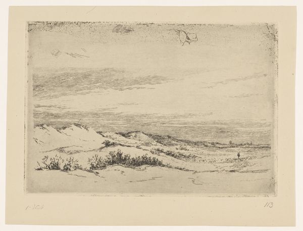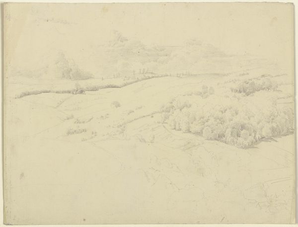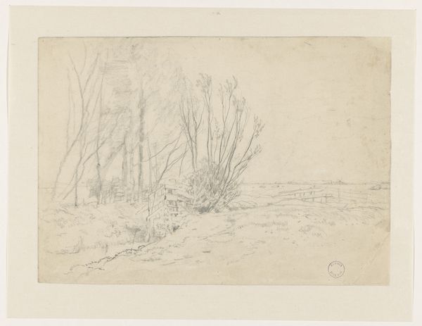 Editor: Here we have Cornelis Lieste's "Heidelandschap," a pencil drawing estimated between 1827 and 1861. There’s a real sense of quiet, an understated beauty. What do you see in this piece, beyond just a landscape? Curator: It's more than just a picturesque scene, isn't it? Look at the delicate rendering of the heath. Think about the 19th century Netherlands. Landscape art wasn't just about pretty scenery. It became a potent symbol of national identity during a period of cultural and political negotiation. Editor: So, the very act of depicting the land became… political? Curator: Precisely! And Lieste, in his realism, shows us not a grand, idealized vista, but an everyday space. A space that could be seen as representative of the lives of ordinary Dutch people. How do we then interpret the artist’s choice to present a heath at this specific time period, using pencil, a less precious, more accessible medium? What statements are being made about nation, class, and representation? Editor: That definitely shifts my perspective. It's a quiet scene, yes, but perhaps quietly radical in its own way? I initially thought of it simply as a pastoral scene and focused on the "realism" style. Now, seeing how art acts a silent medium of expressing intersectional topics makes the landscape so much more meaningful. Curator: It encourages us to reconsider the narratives of nations through art, and maybe to redefine traditional ideas of "landscape" to also represent elements of identity, gender, or politics. The artistic decisions about medium and presentation can provide a voice. Editor: It gives a new appreciation for the voice artists have to contribute in critical conversation. Curator: Indeed! And this quiet little pencil drawing speaks volumes once we begin to unpack it.