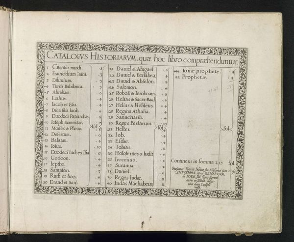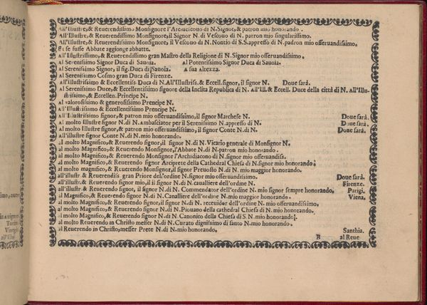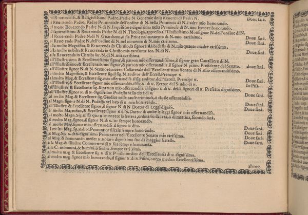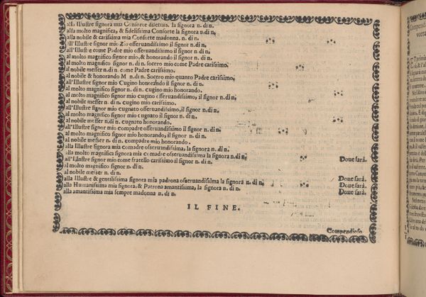 Curator: This intriguing page comes from Pietro Paulo Tozzi's *Ghirlanda: Di sei vaghi fiori scielti da piu famosi Giardini d'Italia*, a print and drawing on paper from 1604. Editor: It reads to me almost as a visual poem, or maybe even a code. The dense text surrounded by that decorative border—there’s a clear sense of considered arrangement at play, yet something feels almost oppressive about the uniformity of the forms. Curator: From a material perspective, the choice of typography is critical. We're dealing with the incunabula of early printing. Tozzi used ink to produce a series of dedicatory inscriptions, templates for formal letters suitable to varying ranks in society, mirroring the rigidly structured hierarchy of the time. Editor: So the seemingly repetitive text is not just filling space. Look closely, and the typography itself varies, the flourishes, the weights—each variation must signify something deliberate within the context of those social rankings. It's a hierarchy visualized. Curator: Precisely. This piece wasn’t created in a vacuum. To fully understand this work, you need to consider its economic and social context: The hierarchies within printmaking workshops, the commerce of disseminating courtly culture, the rising rates of literacy… These letters acted as both template and symbol of social performance. Editor: Yet the effect is almost dizzying. The meticulous rendering almost undermines the possibility of reading any real, embodied intention within these textual structures, or within this object. Is this how Tozzi critiques the emptiness of courtly gestures, or an elaborate reproduction? The frame, filled with stylized flowers, creates a sharp contrast to the regimented text; however, it can also become a binding visual mechanism. Curator: The presence of a decorative, botanical "frame" reminds us of the social context, highlighting consumption practices and artisanal knowledge associated with garden design. But there's always that dialogue between art and its practical function in these situations. Editor: Looking at it again, I notice an intense relationship with language and symbolism that, in this context, I now understand with far more clarity than when I initially approached it. Curator: Absolutely, the more we break down those structures of meaning, the more meaningful these visual texts appear to become!