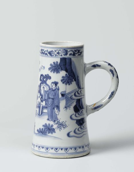 Editor: This ceramic brush holder, dating from the 19th century, features a delicate drawing of bamboo and plum blossoms. I’m really struck by how functional yet decorative it is. What can you tell me about this object? Curator: As a materialist, I'm interested in its production. What kind of labor was involved in creating this? Was it mass-produced for a broad market, or handcrafted for an elite clientele? The blue and white porcelain, the decorative motifs - they speak to a complex history of trade and cultural exchange. Editor: That’s interesting, I hadn’t thought of it that way. Is there anything we can infer about who used this piece based on the materials? Curator: Absolutely. The material, porcelain, indicates a certain level of refinement. But beyond the inherent value of porcelain, consider the process of applying the cobalt blue underglaze – a labor intensive act. Who would be commissioning and using this? And what does it reveal about artistic boundaries during that period, blending functionality with artistic expression? Editor: So, you’re suggesting that the brush holder’s status resides not only in the aesthetics but its cultural and material value, including the making process? Curator: Precisely. How does something seemingly functional transcend into something perceived as "art," and what social constructs enabled that transformation? By examining these components we get a better understanding of the object's role within the artistic landscape and also gain greater insights into cultural values associated with craft, labor, and social identity. Editor: This definitely sheds new light on my understanding of decorative art. Thanks! Curator: Likewise! I'm happy we explored it together.