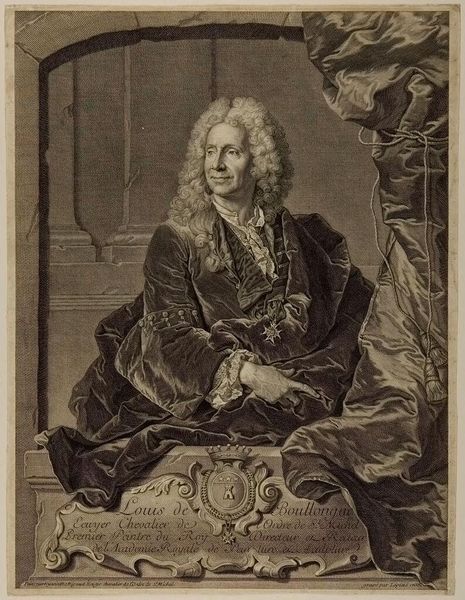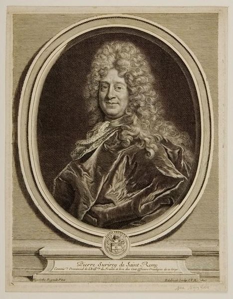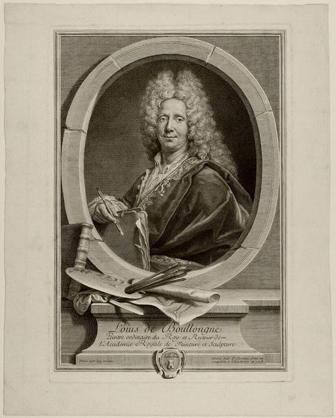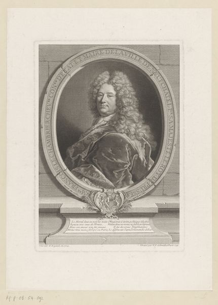 Editor: Here we have Pierre Drevet's portrait of Charles Gaspard Dodun, Marquis d'Herbault. The meticulous detail is impressive. What strikes you first about its composition? Curator: Note how Drevet uses line and texture to define form and status. The Marquis is framed by an oval cartouche, a common Baroque device. Observe the interplay between the textures – the flowing wig against the smooth, idealized skin, the rich fabric contrasted with the stark background. Editor: So the contrast emphasizes the Marquis's importance. Curator: Precisely. The composition directs our eye to the details that signify power and position. The artist, through technical mastery, has created a visual representation of social standing. Editor: I hadn't thought about the textures creating that effect. It definitely sheds a new light on the piece.