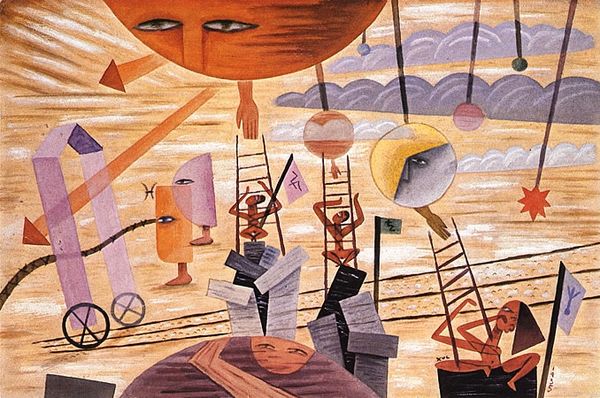 Xul Solar rendered "Vuel Villa" using watercolor, employing a vibrant yet muted palette, in what seems to be a dreamlike urban landscape. The composition is striking: a flying city hovers above a geometric arrangement of buildings and hills, creating a sense of whimsical fantasy. Solar's structural approach here feels influenced by surrealist and constructivist principles, where familiar forms are abstracted and reconfigured. The city in the sky, supported by balloon-like spheres and propellers, suggests a utopian aspiration, while the landscape below, with its sharp angles and simplified shapes, hints at a world reshaped by modern sensibilities. This interplay between organic and geometric forms destabilizes our perception of space and challenges conventional notions of urban life. Note how the artist plays with scale and perspective. This artwork doesn't offer a fixed viewpoint, but instead, suggests the potential for infinite readings and imaginative explorations.