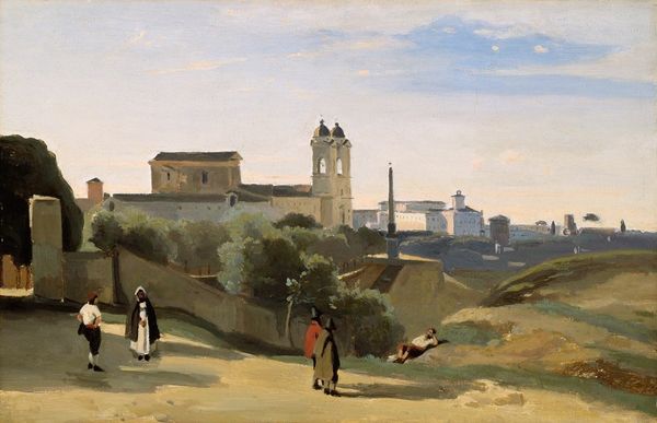 Editor: Here we have Johan Christian Dahl’s oil painting, "The Villa Malta, Rome," created in 1821. It depicts a somewhat serene, sun-drenched scene. There’s a mix of architectural elements and nature that almost feels romantic in a subtle way. What are some of the visual symbols that strike you when you look at this piece? Curator: The Villa Malta, steeped in layers of history, almost tells a story of time through its architecture, don't you think? Note the contrast between the robust tower and the more fragile vines clinging to the structures. Vines often symbolize growth and vitality, but here, in relation to these aged walls, could they hint at resilience, the persistence of nature over time? Editor: That’s a fascinating take! It hadn't occurred to me to consider the vines that way, but that feels very accurate. Are there other elements within the buildings themselves that give insight into how Dahl interpreted Roman society? Curator: Consider the warm color palette against the crisp blue sky. Does that juxtaposition not reflect the allure of Rome during the Romantic period, when artists sought to capture the essence of beauty amidst historical weight? Perhaps the crumbling facade and dominating tower echo the societal structure: power juxtaposed with decay. Editor: That connection makes sense! Now that I look at it with your insights, it’s far less simply ‘romantic’ and more about the juxtaposition of the power and nature. It feels deeply psychological! Curator: Precisely! It is not only a scene, but a conversation with time. Perhaps the artist tries to say that true power has a root in what is organic? Editor: I really appreciate you illuminating the possible readings that the painting inspires. Thank you! Curator: My pleasure! Reflecting on symbols always enriches how we understand the art of our ancestors!