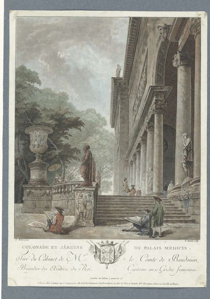 Curator: I am drawn to the quietude, the subtle washes of color that create a serene atmosphere. The cool blues and gentle earth tones give the ruin a certain melancholy beauty. Editor: Precisely. What you’re observing is a piece called "Architektonisches Capriccio: Ruins of a Temple Façade, with Landscape in the Background with Buildings and Bay". This work, held at the Städel Museum, is attributed to Victor Jean Nicolle. It appears to utilize a combination of ink and watercolor. Curator: A Capriccio then. That explains the somewhat fantastical assemblage of architectural elements. It's not quite a documentary, is it? It is about the image of classicism in architecture that inspires awe? Editor: No, absolutely not documentary. Nicolle uses a blend of real and imagined Roman ruins to compose a romantic vision. These architectural fantasies became popular souvenir pieces for Grand Tourists, reminding them of the grandeur they were supposed to feel. Curator: Grandeur certainly feels like the intention. Even in its dilapidated state, the temple evokes power and civilization. The columns, though crumbling, stand as testaments to past glory, and are juxtaposed to men who have pikes or spears with no clear military apparel or function. Editor: And consider the people depicted. We see figures casually interacting amongst the ruins, almost dwarfed by the scale of what once was. Their presence transforms the site into a living space. Curator: So, not just a memento of architectural marvels, but a meditation on the passage of time. And the interplay of history and contemporary life. The light almost seems to symbolize enlightenment shining upon this ruin. Editor: Precisely. Through images like these, the Grand Tourists sought not just to acquire artwork but, it can be argued, an acquisition of "cultured" power and social capital, linking themselves to a lineage of greatness through the very act of collection. The creation and purchase of artworks supported and drove that very image-based economy. Curator: Looking at it with that lens, this simple watercolor takes on far greater weight. It reveals how artworks themselves perpetuate systems of power. I appreciate it on a different level now. Editor: As do I. The visual symbols resonate so strongly once we uncover their history and social context. A seemingly tranquil image is loaded with potent cultural information.