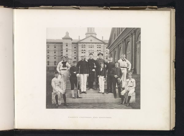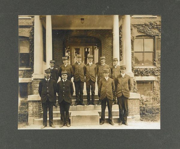 Curator: Looking at this silver gelatin print from 1926 by James Van Der Zee, entitled "Uniform Rank of the Black Knights of Pythias," my first impression is one of imposing order, but with a muted, almost melancholic tone. The strict arrangement of the figures, their uniforms and weaponry, against the architectural backdrop... It all seems to express formality, tradition and perhaps a touch of yearning. Editor: Indeed. Considering the context, it represents so much more. Van Der Zee was documenting the burgeoning Black middle class during the Harlem Renaissance. This wasn't just a picture of uniformed men; it was a powerful statement of Black identity, civic engagement, and fraternal solidarity. Curator: I concur that the societal implications are significant. But let's focus on Van Der Zee's technical mastery. Notice the composition – the way the men are staggered on the steps, creating a layered effect. The use of light and shadow enhances the texture of their uniforms and the coldness of their swords. It's meticulously staged and meticulously captured. Editor: Absolutely, but what that staging *signifies* cannot be ignored! The Knights of Pythias, a Black fraternal organization, offered community, financial support, and a space for leadership during a period of intense racial discrimination. This photograph immortalizes that aspiration for social advancement. Think about it – this was a generation fighting for its rights. Curator: I see your point, yet still, look at their faces. So much is being contained in that stoicism. How carefully the photographer controls the gazes of his subjects. Their upward looking gazes suggests nobility and self-respect. I admire the way he orchestrates a symphony of textures through subtle variations in the blacks, whites and grays. Editor: I'm struck by the contrast between the sharp lines of the swords and uniforms and the soft, almost dreamlike quality of the background. To me this represents the collision of hopes and reality of that historical era. The softness also reminds us of fragility even among these ranks, where death, caused either by poverty or systemic discrimination was a palpable concern for their future. Curator: Well said. This print truly offers both technical beauty and a compelling commentary on its time. Editor: Yes, Van Der Zee gave us both a mirror reflecting the aspirations of a community and a window onto a pivotal moment in history.