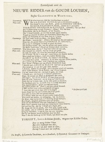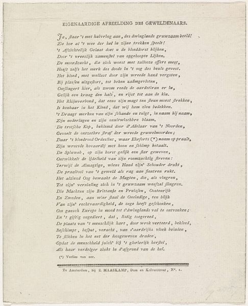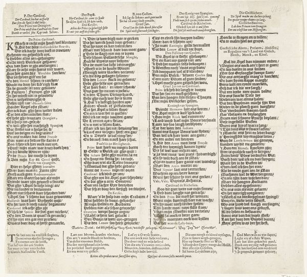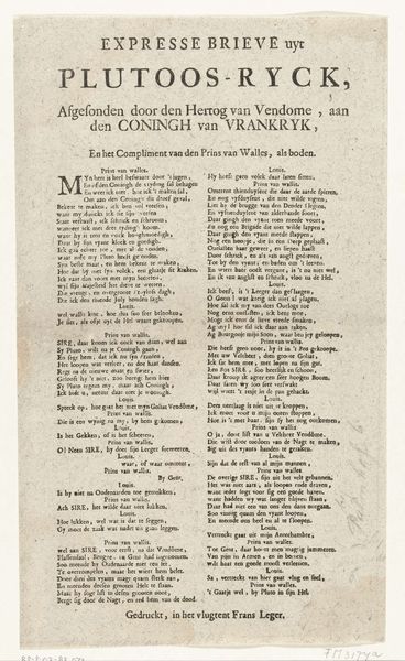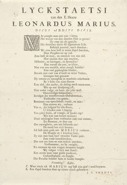 This is a printed poem by Lambertus Paludanus, dating from the 17th or 18th century. The text serves as a family tree for the House of Orange-Nassau, praising their virtues and political achievements. Its production involved the skilled labor of a typesetter, who arranged the individual letterforms, and a printer, who operated the press. The materiality of the poem—the paper, ink, and the very act of printing—imbues it with significance. Printing at this time was a relatively new technology that enabled the wide distribution of information and ideas, contributing to the formation of public opinion and national identity. The poem is not merely a work of art, but also a testament to the power of the printed word in shaping social and political realities. This piece connects the artistry of language with the mechanics of production, challenging any strict separation between the "fine arts" and the broader world of making.