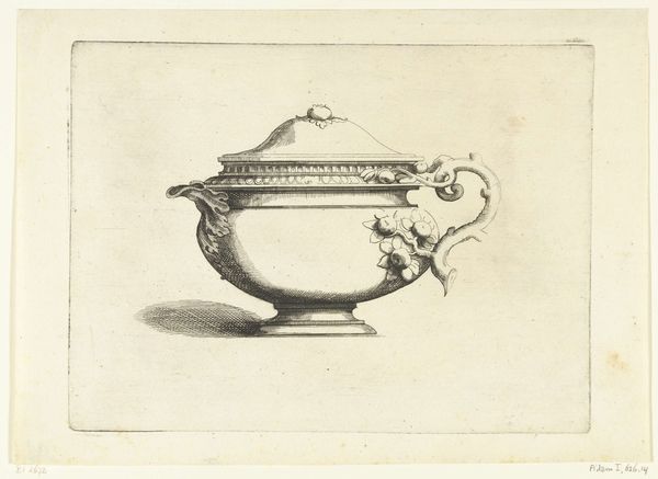 Curator: This drawing is by Pieter Jansz., and is entitled "Deel van een cartouche met een masker en een figuur," or "Part of a cartouche with a mask and a figure." It dates from sometime between 1644 and 1649. Editor: The baroque drama is immediately evident, even in this preparatory sketch. It almost feels theatrical in its ornamentation. I see all that heavy ink and wonder about the source and preparation of the pigment. Curator: Observe how the artist uses ink to delineate not merely outline, but also texture and depth. Consider the strategic placement of light and shadow. What visual rhymes do you notice? Editor: Definitely, it is like stagecraft; those fluid shapes evoke something organic despite the formal lines. You can also clearly see a cherubic figure at the top of the cartouche that adds levity. And yet, look at the pronounced labor in constructing the cartouche itself, as those thick, almost gloopy lines contrast against the light strokes in the wings of the cherub. Curator: Yes, Jansz.’s deployment of baroque form transforms a utilitarian design—the cartouche—into a statement of power. He imbues it with symbolic weight by linking figural representation and geometry. Notice, for instance, how those sweeping, curvaceous flourishes create dynamism while framing that very ordered empty center. Editor: Speaking of dynamism, I keep wondering about the labor involved in actually fabricating a three-dimensional cartouche. Was there a significant craft tradition there, one with its own guild structure and material practices that this drawing might not even make visible? What can this preparatory design really tell us about that reality? Curator: Perhaps it offers a blueprint of artistic intention—an outline of design reduced to pure form. This reveals a structured system of symbolic gestures, an intricate play of surfaces. Editor: And perhaps, if we consider the physical aspects involved with preparing the drawing and what comes after it, we gain a wider scope on the full breadth of production. It certainly grants insight to those obscured hands behind the scenes.