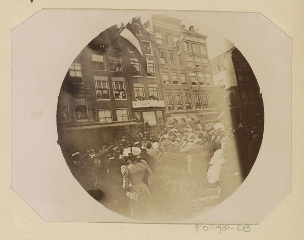 Editor: Here we have a photograph titled "Twee vrouwen op straat in Den Haag," which translates to "Two Women on the Street in The Hague." It was taken before 1894 by Hendrik Herman van den Berg. The figures, though slightly blurred, are captivating; I find myself drawn to the bustling energy and feeling like a quiet observer, even with this aged photo quality. How do you interpret this work within its historical context? Curator: Well, this piece allows us a fascinating glimpse into the public sphere and its performance during the late 19th century. The women are walking from a passenger carriage, quite stylish, but consider what isn’t visible: their class status is telegraphed by their clothing but also limited by public expectations, the streets become both liberating and constricting at once. Editor: So, would their attire carry social or even political messages beyond just signaling wealth? Curator: Precisely. Think of what this seemingly candid photograph actually signifies. The very act of women appearing unescorted, engaging in public life outside of traditionally prescribed roles –shopping, maybe? visiting someone? – this presents a complex negotiation of their status. Further contextual understanding would be needed about laws related to property ownership for women at the time, or access to education that allowed women to operate independently without male kin to be better interpretd. How does the composition strike you? Editor: It's interesting. The women aren’t centered; the background sign and building compete for attention. It creates this tension between the subjects and their environment. Curator: Yes, it is through analyzing these images can become evidence of changing norms. Before wide use of amateur photography and easier media like the Brownie camera by Kodak which came about later in the late 1890s, images had much different importance and significance than do "snapshots" that we view on social media today! I appreciate how it opens this space for the consideration of gendered space within an historical setting. Editor: I had not considered photography being so "precious", because of the difficulties behind producing photographs prior the popularisation of photographic materials. Curator: Exactly, and that's why engaging with socio-historical perspectives enriches our understanding of its many-layered meaning.