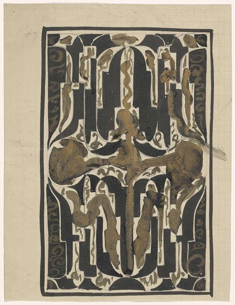 Editor: This is "Ontwerp voor een vaas," or Design for a Vase, created between 1874 and 1945, by Carel Adolph Lion Cachet. It’s ink on paper, housed here at the Rijksmuseum. I find its swirling patterns quite mesmerizing, but some elements appear to be staring back. What symbols jump out at you in this piece? Curator: Indeed, it’s captivating. Notice how the artist employs eyes nestled within teardrop shapes. Eyes have served as potent symbols across cultures – windows to the soul, emblems of surveillance, divine omniscience, or even protection. These embedded eyes, combined with the swirling motifs, suggest a dynamic interplay between observation and concealed emotion. Do you see how the vase form itself, traditionally a vessel for containment, becomes a vehicle for revealing inner landscapes? Editor: I do. The vessel isn't just holding something; it's displaying an interior world. Almost like the vase is alive, or perhaps haunted. Curator: Exactly! Cachet’s design merges form and content seamlessly. Consider the black ink – not just a pigment but a shade associated with introspection, the subconscious, and mourning. It could represent a symbolic lament, a holding of grief. The blank eyes amplify the symbolic power of that melancholy. Does the partial vase sketch on the left offer a different, more hopeful alternative in your mind? Editor: I hadn't considered that. It almost suggests the other possibility is being discarded. This has given me a new way to appreciate decorative arts, viewing them as narratives. Curator: Precisely! Objects carry the weight of human experience, anxieties, and aspirations. Approaching design this way helps us understand not only aesthetics but cultural memory.