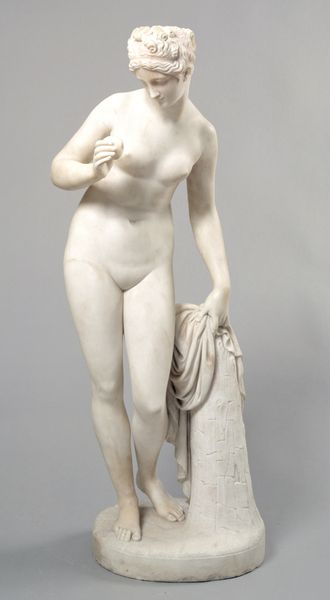 Curator: This sculpture, entitled *Illusie*, its creation spanning from approximately 1400 to 1950 by Johan Hendrik Baars, is crafted from marble. It's an intriguing work, don't you think? What are your initial impressions? Editor: It has a classical feel but its age range makes it puzzling. The texture of the marble and the figure's pose give it an air of both vulnerability and strength. What can you tell me about how its materiality connects to the work’s meaning? Curator: Consider the accessibility of marble itself. For whom was this material available and what social structures underpinned its extraction, distribution and deployment? It mimics a classical style, but the long production timeframe prompts questions about labour. What forms of social relations shaped its existence? How does the marble medium itself carry or contest those relations? Editor: That’s a good point. The timeframe does make it less of a singular artistic vision and more of a collective, extended endeavor. Curator: Precisely. How might shifts in artistic labour or taste over those centuries have impacted the evolving form of the statue? Could we trace material availability or cost as it moved through time? How might that tell us something about this culture? Editor: So you’re suggesting we should focus less on individual intention and more on how material and production reflect larger historical and economic forces at play. Curator: Exactly! By considering the labour, economic structures, and historical context interwoven with the marble itself, the sculpture speaks volumes about artistic production across an extensive time. It offers an unusual opportunity. Editor: That definitely gives me a different perspective on how to approach classical sculpture. Curator: Indeed, it helps us move past aesthetic appreciation alone. Editor: Thank you, I've never looked at sculpture this way!