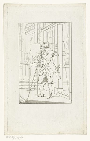 Cornelis Troost created this etching of a resting gentleman outside the inn, 'De Wandelaar'. The composition, dominated by fine, sparse lines, has a light and airy quality despite its subject. The figure’s pose, with a raised glass, creates a focal point that draws us into the scene. Troost masterfully plays with the formal elements to construct a narrative. The lines create textures that define the man's clothing and the surrounding landscape, while the limited tonal range emphasizes form and structure. The inn sign, which reads 'De Wandelaar', acts as a cultural signifier, inviting interpretation of the social and historical context of the piece. The way Troost uses the line and the arrangement of elements destabilizes a straightforward reading. Is he celebrating or satirizing this moment of leisure? This ambiguity is where the print gains its power, challenging us to consider the work and its broader cultural implications.
