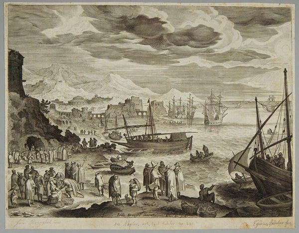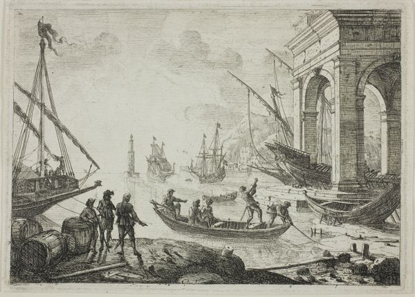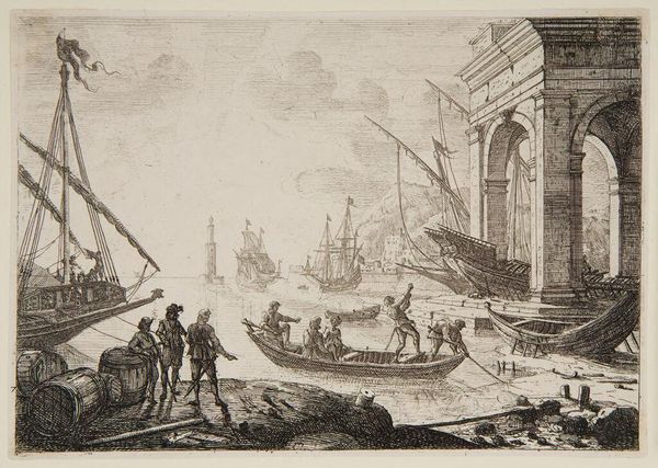 Editor: Here we have Claude Lorrain's "Seaport, With a Large Tower," an etching. The composition emphasizes human activity within this grand port scene, which feels quite busy, almost chaotic. How would you interpret this work? Curator: I see a representation of the labor required to sustain this idealized vision of maritime trade. The printmaking process itself, with its reproducible nature, speaks to the commodification of such scenes for wider consumption. Notice the contrast between the idealized tower and the working figures. What materials do you think these laborers would have been moving? Editor: Perhaps goods like textiles or spices? It does make you wonder about the true cost of those goods and the lives affected by their production. Curator: Exactly. And how Lorrain's print, in turn, became a commodity, part of a system of artistic production and consumption.