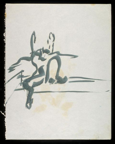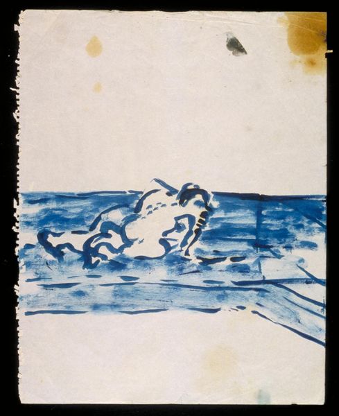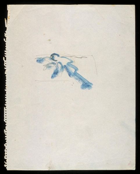 Curator: This is Francis Bacon’s "Figure with Left Arm Raised, No. 1," housed here at the Tate. The support measures 340 by 270 mm. Editor: It’s startling! The figure seems caught mid-motion, or perhaps mid-collapse. The intense blues against the stark white emphasize the tension. Curator: Indeed. Bacon was deeply concerned with the materiality of paint, the viscosity, how it could distort and reveal the human condition. Consider, too, his interest in capturing raw, unfiltered emotion, especially prevalent given his artistic output in the wake of the World Wars. Editor: I’m struck by the simplicity of the composition. How Bacon distills form with just a few strokes to capture a moment of existential angst is remarkable. Curator: A powerful statement about the human form. Editor: Absolutely; it's a compelling study of vulnerability.
