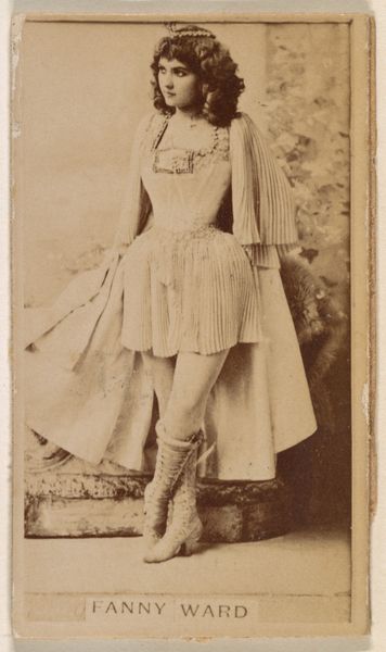 Curator: Immediately, I see a faded postcard of another time, almost a forgotten whisper. It feels theatrical and intimate at the same time. Editor: This is "Card Number 172, Lizzie Hughs" from the Actors and Actresses series created in the 1880s by W. Duke, Sons & Co., best known for their tobacco products. It's currently held here at the Metropolitan Museum of Art. We believe this is a photographic print, possibly combined with a drawing to enhance details, set against a toned paper background. Curator: Ah, a cigarette card! It's fascinating how these tiny artifacts functioned as both promotion and documentation. Lizzie looks like she could tell a story, doesn't she? There’s something so fragile about her gaze, this instant frozen in sepia. I imagine smoke and gaslight. Editor: Indeed. Consider how the photographic medium flattens the pictorial plane and reduces tonal range, contributing to this ghostly image. Structurally, Lizzie occupies the foreground, leaning on what appears to be classical garden architecture. She's the signifier; Duke's Cameo Cigarettes, the signified. The viewer’s gaze bounces from her to the brand name. Curator: It also speaks volumes about beauty ideals of the time. Her attire is intriguing—sort of elaborate but incomplete, her sleeves almost appear as if they're falling off. This hints at vulnerability. Her pose, that casual yet coy posture... what does it conceal? Is she relaxed or poised, inviting or aloof? Editor: Semiotically, every element becomes laden with meaning. The cascade of her hair and ornamented choker draws one’s eye upward, leading to the ethereal quality in her eyes, even when framed as an advertisement. The framing creates tension and contrast that amplifies our impression of a period caught between industry and art. Curator: This one instant now a key into all the complexity it took to produce. I keep circling back to Lizzie's enigmatic stare, wondering if she would believe it’s still viewed and debated after more than a century! Editor: And I am reflecting on how ephemeral moments like these echo long after, repurposed, recontextualized, and ever evocative.