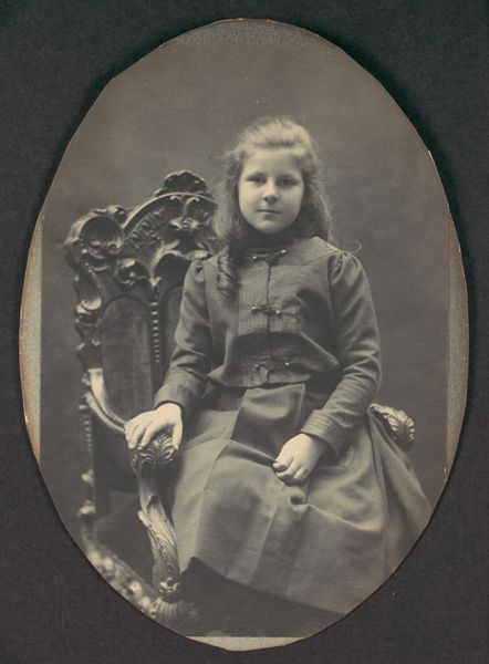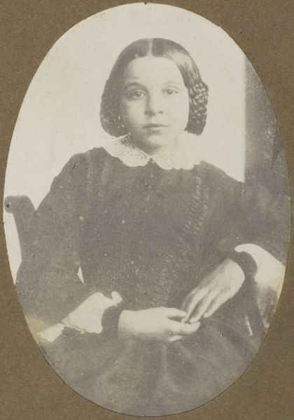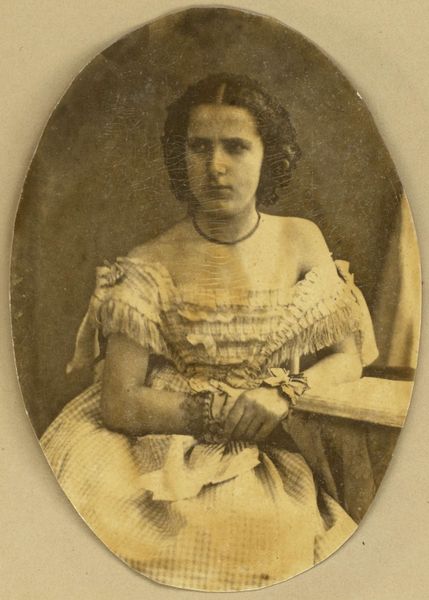 Eduard Isaac Asser created this portrait of a young woman, using photographic techniques that were revolutionary for their time. Notice the oval format, a popular choice that softens the image, focusing attention on the subject's face and costume. The young woman's plaid dress introduces a complex grid of lines and geometric shapes that contrast with the smooth, unadorned background. This interplay creates a visual tension. The texture and pattern of her dress are also signs, suggesting societal norms and aspirations of the period. The way she leans on the table suggests a degree of comfort. Her direct gaze challenges the viewer, asking us to consider the person beyond the photographic representation. This photograph offers a unique exploration of identity and representation. It destabilizes the conventional understanding of portraiture by introducing the mechanical eye of the camera, inviting us to question the nature of realism itself.