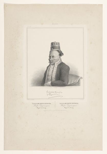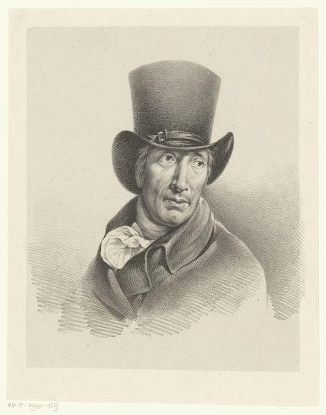 Curator: Here we have the "Portret van Michiel Versteegh," made in 1822, attributed to Guillaume Philidor Van den Burggraaff. It’s a pencil drawing, print and engraving currently held at the Rijksmuseum. Editor: My initial impression is one of reserved strength. The high contrast between the dark clothing and light background creates a focal point that immediately draws you into the sitter's gaze. Curator: Right, and this portrait becomes incredibly interesting when we consider it within the evolving bourgeois class of the Netherlands in the early 19th century. Versteegh's attire and direct gaze project a sense of self-assuredness and burgeoning influence, reflective of broader shifts in social power. Editor: It's fascinating how the portrait also intersects with the prevailing ideals around masculinity at the time. His serious demeanor and somewhat imposing hat might represent aspirations for respectability in the shifting social landscape. The visual narrative hints at the complexities of identity. Curator: Absolutely, the clothing, in particular, isn't just a detail. It’s a sartorial assertion of self, especially considering Versteegh's involvement in public life. His dress and posture broadcast his public persona and role, cementing ideas about class and the performative nature of public life. Editor: I also notice the level of detail Van den Burggraaff achieved. There is great care and craft displayed in the meticulous rendering of his face, particularly capturing a hint of knowingness in his eyes. It feels intimate even across the gulf of time. Curator: That's true, it brings attention to the fact that portraiture wasn't only about replication but also about asserting power relations and constructing public identities through imagery. The image reflects the subject’s societal position while perhaps simultaneously reinforcing or even subtly challenging social hierarchies through its creation. Editor: Indeed. By looking at who this person was, the image offers us insights not just into their world but, more importantly, into our assumptions, privileges, and blind spots. Curator: It becomes a document not only of a man, Michiel Versteegh, but a time and social framework.