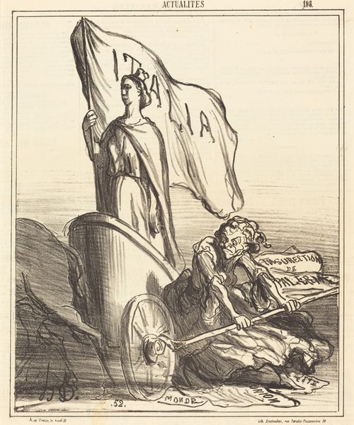Editor: This is "Samos, from Flags of All Nations" by Allen & Ginter, dating back to 1890. It's a print using coloured pencils, originally a cigarette card. What strikes me is the way the flag dominates the scene, yet it's presented in such a casual, almost illustrative manner. What do you see when you look at it? Curator: I see a convergence of consumerism, nationalism, and the exotic. The very materiality of this object – a small, mass-produced card given away with cigarettes – speaks to a society increasingly defined by industrial processes and global trade. The depiction of the Samos flag isn't just about national identity; it's about branding. Allen & Ginter used these images to sell a lifestyle, linking their product with a romantic vision of the world. What labor do you think goes into such cards? Editor: Well, you have the growing and processing of tobacco, and then the entire chain of creating, printing, and distributing these cards! Curator: Exactly! Think of the number of hands this passes through. The coloured pencil rendering, while seemingly simple, would have required skilled illustrators adapting to the pressures of mass production. How does this impact your view of Orientalism in the piece? Editor: That's fascinating. I hadn't considered it so directly linked to the cigarette industry's operations. The camel caravan now feels less like a genuine depiction of Samos and more like a manufactured image for consumption, parallel to how the cigarettes themselves are produced and consumed. Curator: Precisely! By examining the object's materiality and its place within a larger economic system, we gain a more critical understanding of its representation of culture and nation. The exotic is repackaged as a collectible commodity, reinforcing colonial power dynamics. Editor: That makes me rethink the entire image. It's less about the place itself, Samos, and more about how the company presented the place to its consumer. Curator: Right. It's a system of value creation built on many levels: material, labor, and representation all contributing to profit. The seemingly innocent image becomes a testament to industrial capitalism and its global reach.