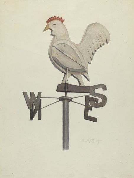 Editor: Here we have Florian Rokita’s "Weathercock," likely from around 1936, created with watercolor and coloured pencil. It feels both practical and whimsical, a study of something so simple. What do you see in it? Curator: Ah, yes, "Weathercock"! I love how Rokita elevates the mundane. It's not just a functional object; it’s imbued with personality, isn't it? That slightly comical posture, the assertive crow... He’s not just pointing us to the wind, he’s narrating a little drama, perhaps? Do you get that sense of playful defiance from it? Editor: Definitely! There’s a bit of cheeky confidence in the way he’s standing, like he’s about to give you his opinion, whether you asked for it or not. And those colors! Curator: Precisely! The earthy tones mixed with that pop of red... almost revolutionary, don’t you think? Reminds me of folk art, the way it democratizes beauty, pulls it from the rooftops into our consciousness. I wonder, does it make you think of any particular stories or rural scenes? Editor: You know, I immediately pictured a farm in a children's book. It feels very accessible, but the artistry is also quite evident. Curator: And that's the genius, isn't it? Simplicity masking sophisticated skill. It prompts you to appreciate the everyday, search for the extraordinary hidden in the ordinary... Perhaps even reassess which way the wind is truly blowing! Editor: I hadn't thought about it that way! Thanks, that was enlightening! Curator: My pleasure! Always a joy to explore the world, and the winds of thought, through art.