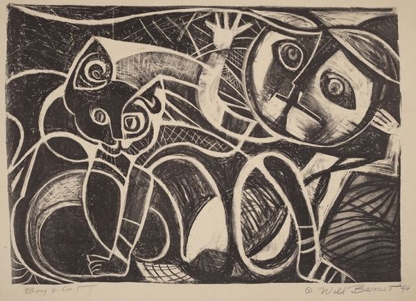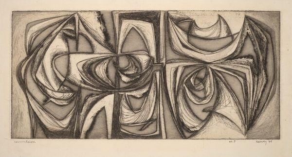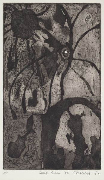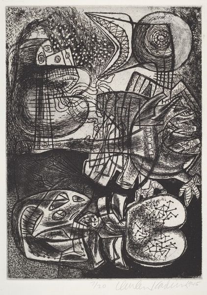 Curator: Right, let's talk about this fascinating "Untitled" etching by Howard Daum, created in 1947. Editor: My first impression? It feels like peering into a collective unconscious, a jumble of symbols and primordial forms. Quite moody, actually. Curator: Indeed! You know, looking at Daum's work from this period, it's easy to see the influence of Abstract Expressionism, with its focus on spontaneous, automatic gestures. He's playing with pure form and abstraction here, leaving behind any clear representational imagery. Editor: Precisely. And that date—1947! Right after the war, a period of immense societal upheaval and questioning. Abstraction became a way to express the unspeakable, the traumas and uncertainties that realist depictions just couldn't capture. These disjointed figures remind me of bodies shattered and scattered after some type of massive sociopolitical event. Curator: Yes, there's a visceral rawness to the mark-making, almost frantic, don’t you think? But it's also balanced, somehow. Notice the distribution of dark and light areas. It draws you in. You might almost get the feeling that it might reveal some sort of secret if you look at it long enough, the way those shapes play against each other, a narrative that's not quite knowable, like a dream fading. Editor: Or a half-remembered nightmare! The symbols, these disembodied eyes, and fragmented shapes—they become signifiers of displacement and trauma. Remember, the avant-garde often saw itself as a response to societal breakdown, striving to forge new visual languages that reflected the instability and anxiety of the postwar world. The heavy reliance on abstract language during this time isn't coincidental at all. Curator: It feels to me, like the artist worked until the composition reached this perfect imbalance and then stepped back. Very brave. But also the result of really putting the time and care in, until this organized chaos emerged! Editor: That tension between order and chaos feels incredibly poignant now, actually. In this current era of political polarization and mass uncertainty, it feels strangely relevant, even timeless. Daum tapped into something truly fundamental. Curator: Agreed. This artwork offers a glimpse into an interiority, a sense of humanity at a critical juncture. Editor: An open text inviting us to fill in its gaps. Profound!