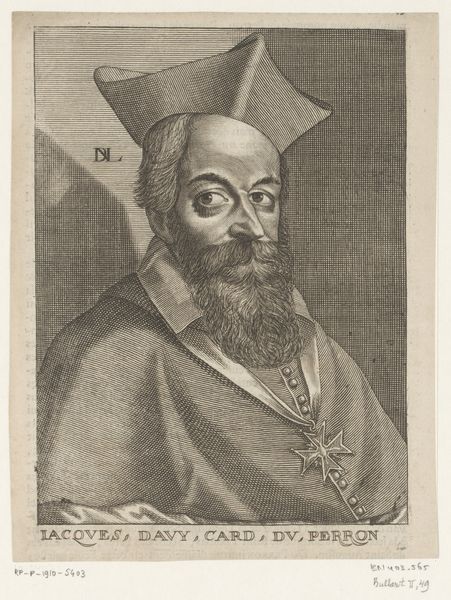Curator: So, here we have Frans van den Wijngaerde’s print from between 1636 and 1679. It’s entitled, "Portret van de Franse kardinaal Jacques Davy Duperron." Quite the mouthful, isn't it? What strikes you first? Editor: The sheer stillness. It’s almost haunting. That fixed gaze and elaborate hat! There is a sense of immense power, but it feels constrained, almost melancholic, don't you think? Curator: Interesting. The lines, so fine and precise, capture the Cardinal’s likeness in such detail. The hatching creates a sense of depth and texture, particularly in his beard and the folds of his robes. Technically, it's a masterful display of Baroque engraving. Editor: True, the technical skill is undeniable. Look at how the light catches the side of his face—yet there's a flatness, a kind of emotional distance created by the medium. It makes me wonder what the real Jacques Davy Duperron was like. Did he also project such a formal facade? Curator: We can speculate. This work highlights the social context of portraiture. The meticulous rendering surely aimed to convey not just physical appearance but status and authority. The Baroque loved drama, but here it feels almost…subdued, reined in. Editor: Subdued power. It's that contrast that’s so compelling! A man of the church, captured in the very precise, unforgiving lines of the engraving. There’s a rigidity to the form. Curator: Yes. Think, the original likely served a very specific purpose: immortalizing the Cardinal. Frans van den Wijngaerde does just that through masterful skill, despite how still and somber the engraving now strikes us. Editor: Maybe that stillness, that perceived melancholia, speaks to something beyond just representation. Perhaps it inadvertently captures the weight of his position. The lines reveal not just form but also perhaps the man's inner life, the responsibility of that big, silly hat! Curator: A potent reading! Perhaps it's precisely in this interplay of meticulous detail and underlying unease that the artwork retains its power centuries later.