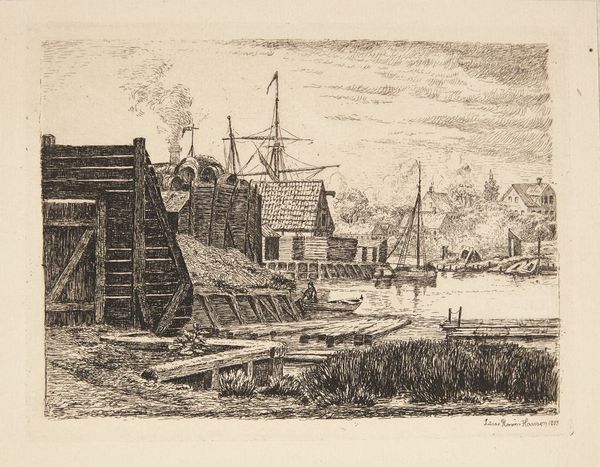 Curator: Quentin Pierre Chedel's "Landschap met twee huizen en bedrijvigheid aan een kade," created sometime between 1715 and 1763, offers a fascinating glimpse into 18th-century Dutch life. The artwork, housed at the Rijksmuseum, is an engraving that details a bustling waterside scene. Editor: Immediately striking is the light and shade contrast – quite dynamic for an engraving. There’s a softness too, an atmospheric quality despite the precision of the lines. Curator: This etching offers us a tangible connection to the everyday realities of the period. Look at the labor taking place by the docks – the loading and unloading of goods, likely crucial for the local economy. Notice how the architectural style of the two houses reflects practical considerations of materials and craftsmanship, speaking volumes about available resources. Editor: Structurally, I'm intrigued by how the composition directs the viewer's gaze from the darkened foreground, featuring a man on horseback, back toward the detailed activity at the wharf, finally resolving in the expansive, lighter tones of the water and sky. The repetition of vertical lines in the rigging of the ships creates a visual rhythm that's quite engaging. Curator: And consider the consumption patterns embedded in the imagery. This type of genre scene provided an aestheticized view of labour for wealthy patrons who very likely acquired such images, solidifying class boundaries via depiction. It’s more than just a pretty picture; it is a document revealing much about the organization of labor in Dutch society during that period. Editor: Certainly, one could see that. The figures working have become picturesque, integrated within this balanced and beautiful schema of line and form. Yet, do the signs of labor overshadow an appeal to visual harmony and balance characteristic of its time? Or does it successfully blend social commentary within an accessible and beautiful whole? Curator: Perhaps, therein lies its complexity – art and labor, intertwined in production and interpretation. Editor: Indeed. I’ve enjoyed how its formal qualities opened up discussion about its cultural implications, grounding abstract concepts of line and light with evidence of work and manufacture.