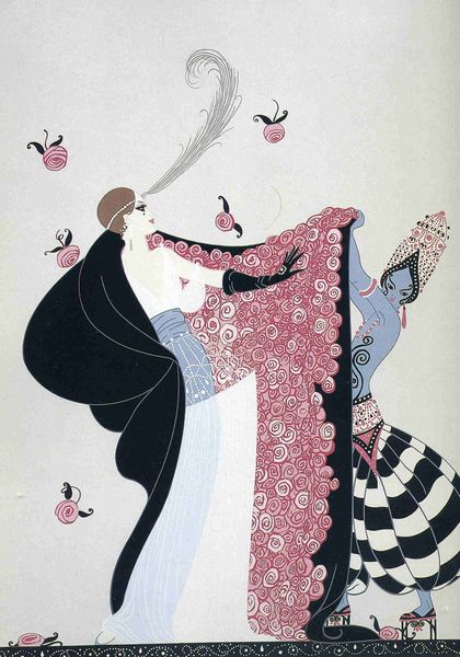Editor: Here we have Gerda Wegener’s 1916 watercolor drawing, "A Little Rascal." I'm struck by the pastel palette and the overall feeling of lighthearted chaos. What do you make of Wegener’s depiction of domestic life in this piece? Curator: From a materialist perspective, I find it compelling to consider how Wegener utilizes watercolor, a medium often associated with delicacy and femininity, to portray a scene that hints at social tensions and burgeoning consumer culture. Notice how the rendering of luxury items like the tea set contrasts with the somewhat flattened, almost illustrative style. It isn't about illusion, but a commentary. How does the empty picture frame overhead resonate with you, considering that? Editor: That's interesting. I hadn’t really noticed the empty frame. So you are suggesting that Wegener is focusing more on the constructed nature of this interior space rather than trying to depict reality? Curator: Precisely. And look at the precise draftsmanship describing how these commodities would feel as objects-- the weight and function of them. In rendering that dog as the instigator, and by dressing the lady in fanciful caricature of formal attire, we get insight into a society undergoing change with access to mass-produced goods and emerging freedom for the socialite class of women. Does that alter your sense of what she might be saying? Editor: Definitely. It makes me think about the labor involved in creating these scenes of leisure, and how Wegener's work sort of exposes that. The messiness is less incidental now. Curator: Exactly. Perhaps thinking through the art-nouveau aesthetic brings her interests in material culture to bear in new ways for you. Considering the feminist art influence helps focus on how Wegener is portraying women, both in art, in the culture, and the economic place of women. It underscores those class differences inherent in “A Little Rascal," don't you think? Editor: I see that clearly. Thank you, I never thought I would analyze an image of a dog! I'll certainly look at Wegener's work differently from now on. Curator: Likewise. It is enriching to realize what the artist considers the most import to the work, and by following those decisions to see what meaning may lie in what the culture uses as the 'materials' of art.