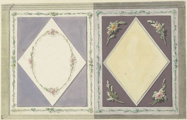 Abraham Meertens created this design for room decoration with watercolor and pen around the turn of the nineteenth century in the Netherlands. The two panels, each with a diamond shape at the center, represent the fashionable taste for neoclassical interiors at that time. We see floral motifs, scrollwork, and classical figures, which were popular elements in interior design. These were meant to signal refinement and learning for those who inhabited the space. Amsterdam was then a major center of commerce and culture. Wealthy merchants and patricians sought to emulate the lifestyles of aristocrats through carefully designed domestic environments. Studying the social history of Dutch design through archival sources, like estate inventories and architectural plans, gives insight into how people wanted to present themselves through their homes. This image reflects the values and aspirations of a society undergoing significant economic and political change. It shows a culture seeking to define its identity through visual display.