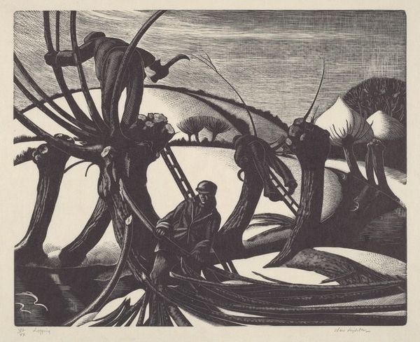 Richard Florsheim created this unsettling lithograph, "He Walks Alone," in 1951. Just look at the way he lays down the marks, like anxious scribbles, that build up this strange, desolate scene. What hits me is the contrast between the solid forms of the crumbling structure and the ephemeral quality of the sky. The little figure of the man almost disappears against the weight of this looming, dark structure. Those dripping forms remind me of melting wax, or maybe tears? It's like the whole scene is dissolving before our eyes. This piece reminds me a little of Piranesi's etchings, with that same sense of architectural dread. Both artists, in their own way, tap into this feeling that the world is a stage, and we’re all just wandering through it, trying to make sense of the scenery. It's a reminder that art doesn't always have to be pretty; sometimes, it can be a mirror reflecting our own unease and uncertainty.