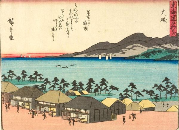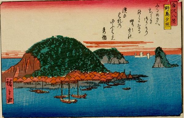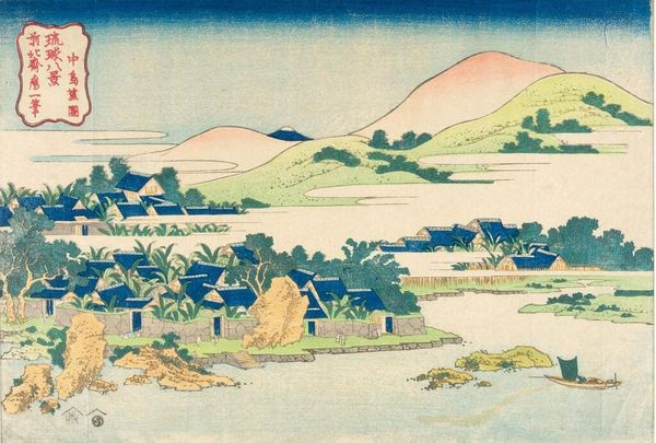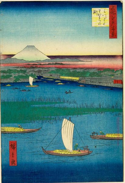 Editor: Here we have Hokusai's "Tsukuda Island in Musashi Province" from his series "Thirty-Six Views of Mount Fuji." I'm struck by the sheer flatness and the way the boats are scattered across the composition. What organizing principles do you see at play? Curator: The strength of this print lies in Hokusai's masterful manipulation of line and form. Note the rhythmic repetition of the boats, each delineated with precise, unwavering lines. How does this contribute to the overall aesthetic? Editor: It almost creates a sense of visual harmony despite the varied activities depicted. It seems the lines are the most important element in this work. Curator: Precisely. The linear quality is paramount, defining not just the objects, but also their spatial relationships. Consider how the lines direct the eye toward the distant Mount Fuji, a compositional anchor. Do you agree? Editor: I do. I hadn't quite focused on that before, but now I see how the lines create a path. Thanks!