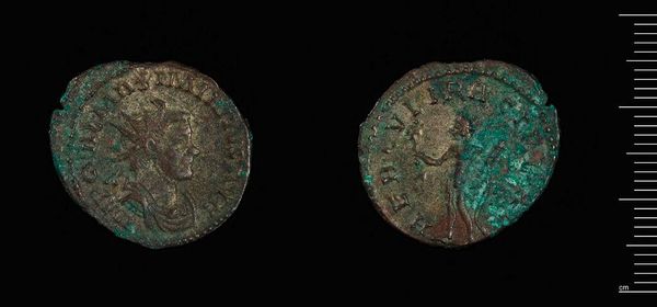 Curator: What a poignant object. This is a sestertius of Philip I, also known as Philip the Arab. Editor: It’s incredible. Even with the verdigris, you sense the weight of history, the stories held in that small, worn metal. Curator: Note the incised portrait of Philip, framed by a laurel wreath, a powerful symbol of victory and status in Roman iconography. Editor: And, of course, Philip's reign marks a fascinating period of openness to religious diversity, especially considering his possible Christian sympathies, challenging conventional imperial narratives. Curator: The obverse bears the figure of Pax, a representation of peace, which underscores the ambition of the Roman Empire. Editor: True, but it also reminds us of the empire’s constant struggle to impose that Pax Romana, its iron fist disguised as a symbol of serenity. Curator: Indeed. It is a powerful object, rendered all the more potent by its form and function as currency. Editor: Yes, it's a reminder of how power and image are always intertwined. A fittingly complex, enduring artifact.