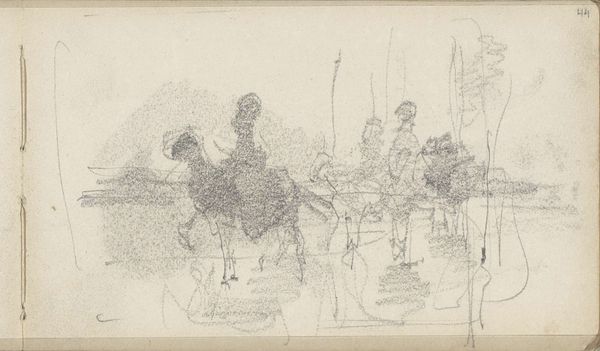 Editor: This is "Terrace, Luxembourg," a drawing by James Abbott McNeill Whistler. I’m struck by the sketchiness of the lines; it feels so immediate. What elements of the composition stand out to you? Curator: Indeed. Consider the deployment of line. Notice how Whistler uses hatching and cross-hatching, not to define form, but to create an interplay of light and shadow, almost dissolving the figures into the landscape. Do you perceive how the negative space is as active as the positive? Editor: Yes, now that you mention it, the blank areas feel just as important as the marks. Curator: Precisely. It is through this delicate balance that Whistler achieves a sophisticated visual harmony. The lack of detail invites the viewer to complete the image, to participate in the creation of its meaning. Editor: That's a great point. It really makes you look closely. Curator: Agreed. It is through such close observation that the true essence of Whistler's artistry is revealed.