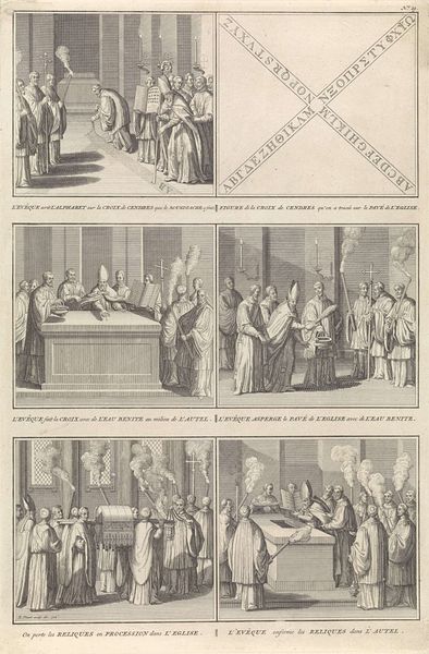 Bernard Picart created this print, "The Three Higher Ordinations in the Roman Catholic Church," sometime between 1696 and 1733, using etching and engraving. The image shows, in four panels, the ordination of subdeacons, deacons and priests. Each panel depicts the interior of a Catholic church, recognizable from its altar, candlesticks and crucifix. The panels are accompanied by descriptions in French. Picart was a French engraver who converted from Catholicism to Protestantism, and he may have created this image to document Catholic rituals for a Protestant audience. This was a period of intense religious conflict in Europe, with the Catholic Church often portrayed negatively in Protestant propaganda. The print offers an insight into the hierarchical structure of the church and how its authority is passed down through formal ceremonies. Understanding the institutional history and the religious context of Picart’s time helps us interpret such images, and for this, historians rely on resources such as letters, pamphlets, and other images from the period.
