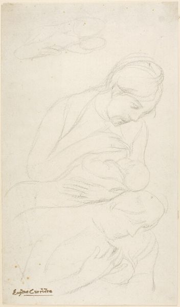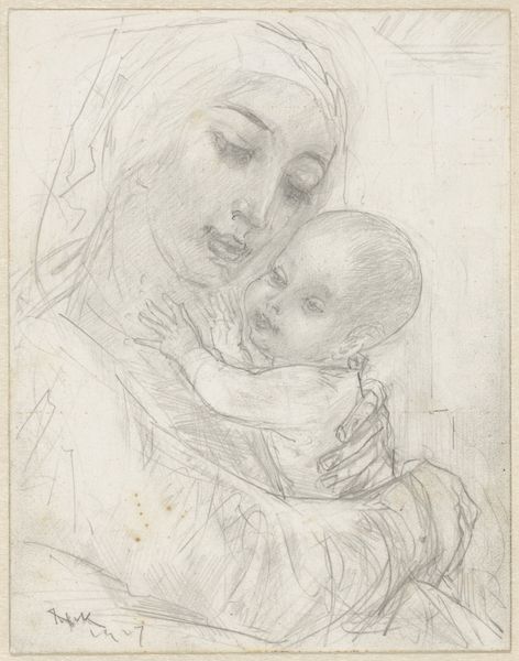 Karl Kappes created this pencil drawing, 'Madonna with Child,' sometime in the 19th century. The image of the Madonna and Child has a deep history in Western art, closely tied to the teachings of the Church and, in particular, its doctrines on the family and the role of women. Here, we see Mary depicted with gentleness and love. The lack of adornment suggests a focus on her humanity. Kappes lived and worked in Germany during a period of great social and political change. Consider the rise of nationalism, new ideas about the role of religion in society, and transformations in family structure. How might these changes have influenced an artist choosing to depict such a traditional subject? Was Kappes seeking to reinforce traditional values, or was there something more complex at play? To understand this work better, we might look at the religious art education of the time, the influence of different artistic movements, and the broader social context in which it was produced. It reminds us that art is always rooted in its specific time and place.