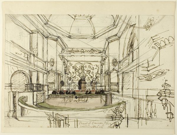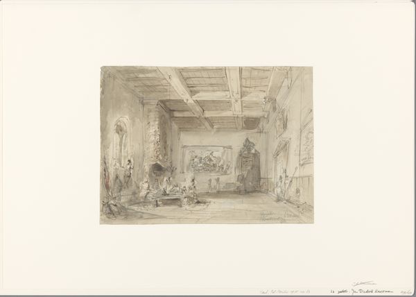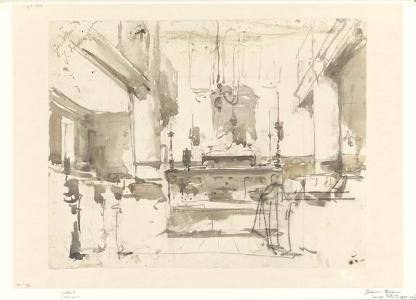 Curator: This drawing by Johannes Bosboom is titled "Interior of the Geertekerk in Utrecht." Executed between 1827 and 1891 using pencil and etching, it provides a glimpse into sacred spaces. Editor: It feels sparse, almost melancholic, doesn't it? The quick pencil lines and empty space evoke a quietness—as though everyone has left the building. Curator: I think it invites us to contemplate institutional authority, actually. Note the geometry, these arches—symbols of power rendered with understated tools by a man working in an era marked by rapid societal shifts and questions about faith's place within the secular world. How might Bosboom use these images of architectural tradition to talk about modern life? Editor: Well, to me the arches echo ancient cathedrals—a classic signifier of enduring spiritual tradition but re-envisioned. Even rendered in light pencil sketch there is weight in such an obvious symbol. It connects directly to centuries of believers seeking solace. Curator: Do we only understand it as that though? Thinking through a contemporary lens, it reminds us of religious institutional power, particularly with that raised pulpit. Who gets to speak? Who is included? It's hard not to read a critique into how space is defined and authority displayed. Editor: An interesting question to put to a nineteenth-century church interior; I think there may be an argument for considering what exactly constitutes symbolic use. Either way it appears this place carries centuries of beliefs regardless if we question power and social standing. Curator: I appreciate how it can embody so many threads – power, peace and spiritual unease. Thank you. Editor: Agreed. The simple line captures far more than architecture alone.