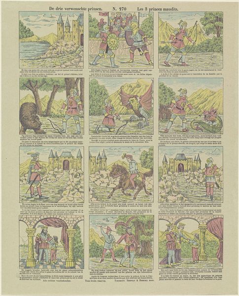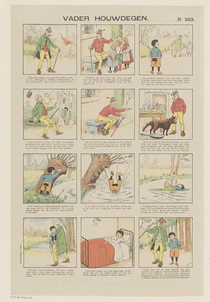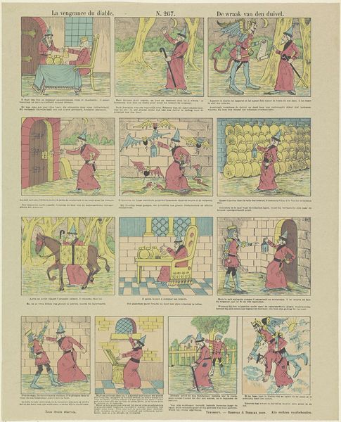 Editor: This artwork, titled "De eikel en de pompoen / Le gland et la citrouille," is an older print dating sometime between 1833 and 1911 by Brepols & Dierckx zoon. It uses a sequence of images like a storyboard, and its style reminds me of early comic strips. The faded colors give it a charmingly antiquated look. What structural elements draw your eye when you examine this work? Curator: The sequential narrative is indeed intriguing, particularly how each frame meticulously balances figure and ground. Notice the consistent repetition of the main character across the frames. His posture and attire create a rhythmic visual echo. It compels us to read left to right, top to bottom. Also consider the curious contrast in palette, using these faded blues and oranges. What is the relationship between the subject and its arrangement? Editor: Well, I initially saw it as simply a series of scenes, but you're right, the consistency forces me to consider it as a unit. And I hadn't really paid much attention to how these pale greens, reds, and browns appear through all ten boxes. How does this piece fit into narrative-art overall? Curator: This work prefigures elements we find later in graphic novels. It directs our eyes using compositional cues, a structured grid layout and a commitment to balance. I suggest exploring works from the same period that also employ this technique, you might find visual and intellectual inspiration for new art projects. How did this help refine your perspective on this print? Editor: Seeing the repeated structure has been helpful, and the relationship between the panels is very clear. Focusing on these inherent elements offers a greater appreciation for it. Thank you. Curator: A deep dive into the structure is the surest way of understanding.