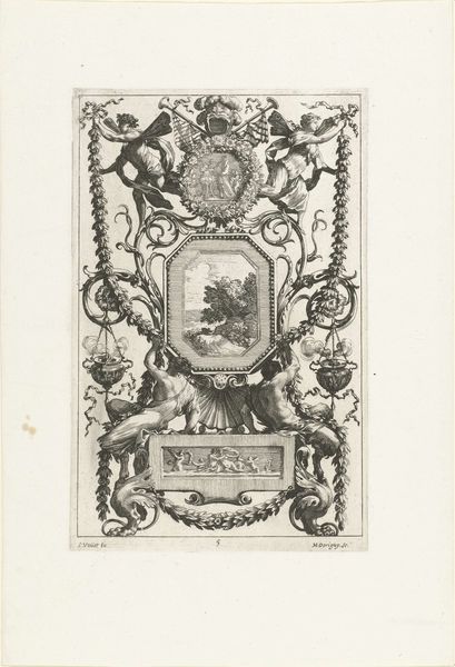 Editor: This is a wall panel design with two putti under an octagonal frame, dating back to 1647, created by Michel Dorigny. The engraving’s level of detail and intricate ornamental elements immediately struck me. It seems so precisely planned and carefully constructed. How would you interpret this work within its historical context? Curator: Looking at it through the lens of social and cultural history, we can see how it reflects the Baroque era’s emphasis on grandeur and elaborate ornamentation. The putti, the complex swirling forms, the sheer density of visual information—these elements speak to a desire for imposing artistic statements. How might this aesthetic relate to the political landscape of the time? Editor: Perhaps as a symbol of power and stability? These ornate designs seem to affirm control. But were pieces like this accessible to everyone? Curator: That's precisely the critical question. Engravings, although more accessible than original paintings, still catered largely to elite audiences—the aristocracy and wealthy merchants. They offered a way to disseminate images, but also to solidify and propagate a specific aesthetic taste connected to social status. Do you notice anything about how the composition might reinforce this idea? Editor: Well, there's a clear hierarchy of imagery, from the classical scene at the top to the landscape in the center. Everything feels so meticulously ordered. This suggests a very controlled view of the world. Curator: Exactly. The order isn't just decorative; it communicates a specific worldview. It reflects an age when institutions like the monarchy and the Church sought to impose their order upon society and culture. Thinking about the museum context today, do you think displaying engravings like this alters its historical meaning? Editor: That's a good point. Placed within a museum setting, we might analyze this engraving from many different angles rather than simply admiring its artistic skills or enjoying its overt aesthetic. This gives it new life and appreciation, but also different, nuanced political considerations, perhaps. Curator: Precisely. Reflecting on it this way helps us see beyond mere aesthetics to how power operates within the history of imagery. It’s a reminder that even seemingly innocent designs can carry significant social and political weight.