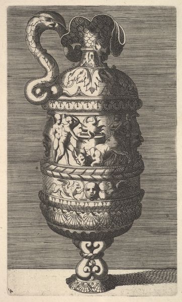 Editor: This engraving by Enea Vico, created between 1543 and 1573, depicts an ornate lidded vase with sphinx-like handles. It’s brimming with decorative details, creating a rather fantastical feel, almost like something from a dream. What do you see in this piece? Curator: It’s fascinating how Vico recreates a classical vase, loading it with potent imagery. Notice the hybrid sphinxes – female heads atop powerful animal bodies. This combination speaks to a complex relationship between intellect, beauty, and primal instinct. Can you see the masks? Editor: Yes, just below the sphinxes and above the festoons of leaves and flowers. What does the mask refer to here? Curator: The masks introduce the idea of transformation, performance, or even hidden identity. Consider the vase itself; it’s not merely a vessel but a symbol of containment. It is a cultural artifact, yes, but it holds not just liquid, but layers of meaning inherited from its source object: the Antique. Do you observe how that phrase and a pseudo-signature are presented, carved onto a tablet at the base? It’s like a rediscovered relic, almost unearthed! How does all of that speak to you? Editor: I see, it’s as though Vico isn't simply depicting an object but reinterpreting a cultural memory. He uses symbolic language to evoke a lost world, filtered through the lens of the Renaissance. The layers build a fascinating impression of something ancient, precious, and powerful. Curator: Precisely. Vico masterfully weaves together classical motifs and Mannerist sensibilities, inviting us to contemplate the enduring power of symbols across time. Editor: It’s incredible how much narrative is packed into what I initially saw as just a decorative object. I see now how it connects us to cultural roots! Curator: Indeed, art allows us to participate in a very ancient symbolic dialogue that continues even today.