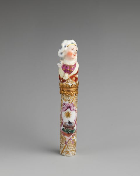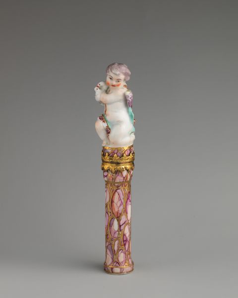 Curator: This porcelain sculpture, dating from 1745 to 1760, is titled "Three children in a group," made by Saint James's Factory and currently residing at The Metropolitan Museum of Art. What strikes you first about it? Editor: It's exquisitely delicate, almost fragile in appearance. The colour palette is restrained, emphasizing the fine details of the forms. It projects this sort of quiet, classical mood. Curator: Indeed. When looking closely at "Three children in a group", we see the craftsmanship really stands out. The use of porcelain, especially from Saint James's Factory, meant this would have been part of the increasing culture of conspicuous consumption during that era, intended for display in a bourgeois household. Editor: The formal structure seems very important here. Notice how the column-like base leads up to these meticulously rendered children. Above that are those flourishes, an almost excessive floral adornment. The relationship of forms here certainly provides much interest for analysis. Curator: I’m also drawn to considering the division of labor involved. Porcelain production was hardly a solitary endeavor, the processes of molding, firing, and painting meant entire workshops devoted to these luxurious objects. Editor: Do you think it intentionally resembles classical architectural components? Because that fluted body and the capital with those delicate flowers are, in my opinion, directly trying to remind the viewer of some important civic virtue, expressed through form and material. Curator: Perhaps, but let's consider how such a design normalizes ideas about childhood. A porcelain that displays children that were idealized—presumably as cherubs, rather than considering child labor as a common aspect of eighteenth-century British society, creates a distorted narrative that romanticizes specific values about work and class. Editor: Regardless, seeing this piece reminds us about the beauty found in formal articulation of porcelain art during this period. Curator: It definitely reminds me to reflect on all those processes involved in its creation!