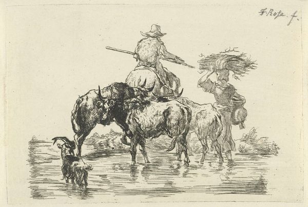 Editor: So, this etching, "Two Herdsmen with Cows," by Romeyn de Hooghe, likely created between 1655 and 1667, strikes me as… surprisingly intimate. The figures almost blend with the animals, and the rough strokes make it feel very immediate. How do you interpret the scene, considering the socio-political environment of the time? Curator: The scene is indeed intimate. The Dutch Golden Age witnessed a flourishing of genre painting, and works like this catered to a burgeoning middle class eager for images reflecting their everyday lives and idealized rural settings. How might this image speak to a particular understanding – or perhaps misunderstanding – of rural life held by city dwellers? Editor: That’s interesting…so maybe this pastoral image served a sort of escapist fantasy for city residents? A way to connect with an idealized past, perhaps? Did art like this reinforce or challenge existing social hierarchies? Curator: Exactly! Consider the placement of such imagery. Where were these prints displayed, who purchased them? Were they used to furnish the homes of wealthy merchants who sought to legitimize their newly acquired social standing through associations with the "simple" life? This contrasts with the realities of rural labor and class structure of the time. Editor: Ah, so by presenting a harmonious, simplified image of country life, it almost obscures the more complex social relations that existed. The reality for most people working with animals back then probably wasn't so idyllic. Curator: Precisely. And thinking about the Baroque style, notice the dramatic, though subdued, contrast and how that might affect the reading of the imagery by an early modern public steeped in classicism and religious iconography. Do you think that de Hooghe, through this genre painting and stylistic elements, critiqued or reaffirmed these values? Editor: I never thought about landscape imagery playing such an important social role, not just reflecting but shaping perceptions of rural life and societal structures! I'll definitely keep that in mind going forward. Curator: It's a fruitful perspective. Recognizing art as part of complex systems of exchange can unveil subtle layers of meaning that are otherwise hidden.