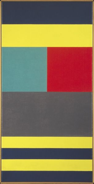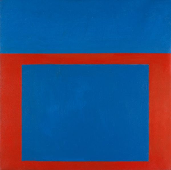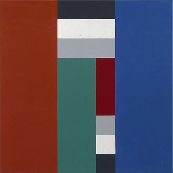 Curator: Camille Graeser's "Disloziertes grünes Quadrat," or "Displaced Green Square," created in 1971. It’s a work rooted in concrete art principles. Editor: It has such a striking austerity, wouldn't you say? A powerful, yet unsettling calmness. It definitely demands attention! Curator: Absolutely. The displaced green square is the focal point. Squares traditionally represent stability, but here, it’s turned, destabilized. It subtly undermines assumptions of order. Graeser's exploration of geometric forms isn't arbitrary, it's a study of visual language itself. Editor: I agree, and given the socio-political upheavals of the early 70s, could the tilted square also speak to societal imbalances? Green often represents growth and life, perhaps disrupted or questioning its conventional placement. This composition echoes feelings of disquiet and uncertainty that were so dominant in that era. Curator: Interesting observation. The symbolism in the interplay of the squares! The cool blues and yellows contrasted with the expansive field of muted red, and the darker squares almost feel like a shadow cast by these larger societal tensions, with that central disruption pulling you in, even now. Editor: And there's something undeniably masculine in this stark reduction. Do you feel this composition consciously refutes earlier expressionistic gestures that perhaps were considered feminized at the time? It could reflect power structures in the art world as well. Curator: It's a persuasive argument. I interpret its clarity and simplification through the lens of a desire to transcend subjectivity, to get at a kind of elemental truth inherent within geometry. Perhaps even allude to the power of change and shifting perspectives. Editor: Indeed. In contemplating Graeser's choices here, it becomes obvious that "Displaced Green Square" holds not just visual interest, but a loaded conversation concerning cultural perceptions of balance, structure, and rebellion. Curator: Precisely, a great reminder how images distill meaning across generations. Editor: Certainly—a silent, angular call to reconsider our positions, as active participants and thoughtful onlookers!